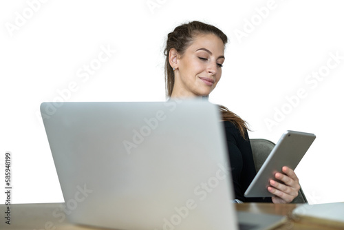 © muse studio, Naklejka premium Young female freelancer daily work with computer and tablet online, transparent background, png, isolated.