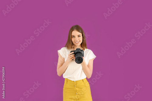 © Pixel-Shot, Obraz premium Young female photographer on color background