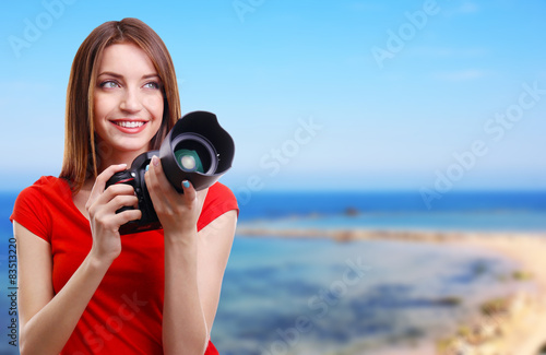 © Africa Studio, Fototapeta premium Young female photographer taking photos on nature background