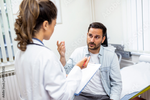© Graphicroyalty, Obraz premium Young female professional doctor physician consulting patient, talking to adult man client at medical checkup visit. diseases treatment. medical health care concept