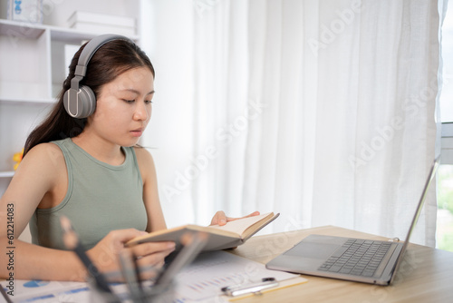 © Puwasit Inyavileart, Obraz premium Young female student reading a book in a private office, Self study, Textbooks from books, Find out more, In the office there is a computer or laptop placed on the table, Study.