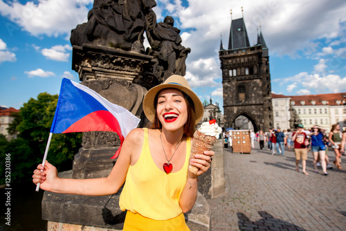 © rh2010, Obraz premium Young female tourist with traditional czech dessert called trdelnik and flag on Charles bridge in Prague