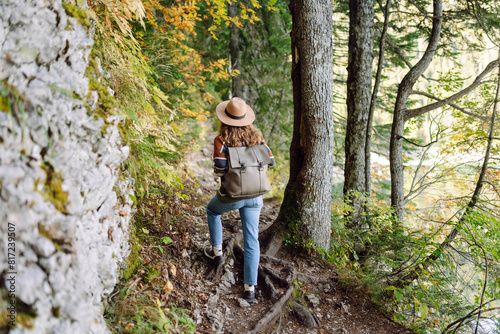 © maxbelchenko, Naklejka premium Young female traveler with backpack standing in forest with tall coniferous trees, enjoying nature. Weekend, tourism.