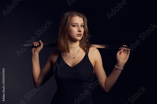 Fototapeta premium Young female with katana on black background