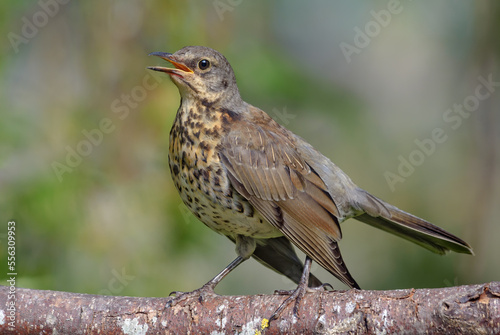 Fototapeta premium Young Fieldfare thrush (turdus pilaris) sings his song on lichen covered...