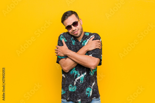 © Asier, Fototapeta premium Young filipino man wearing summer clothes hugs, smiling carefree and happy.