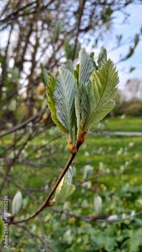 © Olena Kuzina, Naklejka premium Young first spring leaves on a branch