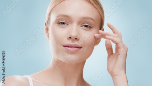 © pavel_dp, Fototapeta premium Young fit attractive European woman with light hair touches her cheek looking at the camera against blue background | Acne prevention concept