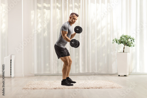 © Ljupco Smokovski, Naklejka premium Young fit man lifting dumbbells at home