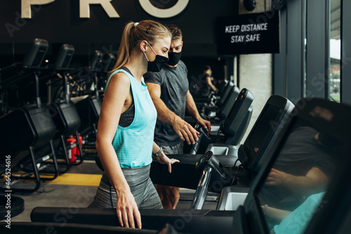 © Dusko, Fototapeta premium Young fit woman and man running on treadmill in modern fitness gym. They keeping distance and wearing protective face masks. Coronavirus world pandemic and sport theme.