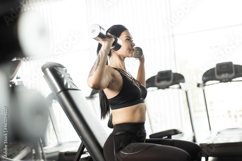 Fototapeta premium Young fitness brunette woman doing overhead dumbbell press while sitting on bench in the gym