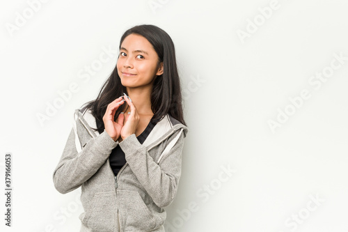 Fototapeta premium Young fitness chinese woman making up plan in mind, setting up an idea.