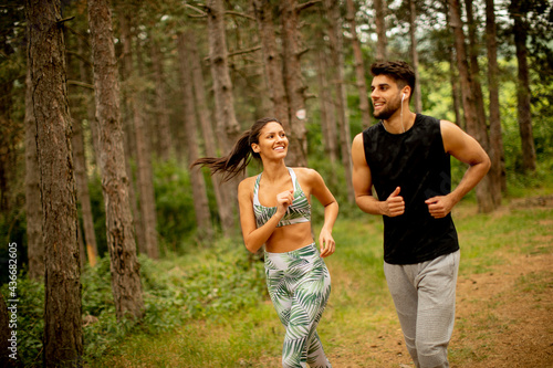 © BGStock72, Fototapeta premium Young fitness couple running at the forest trail