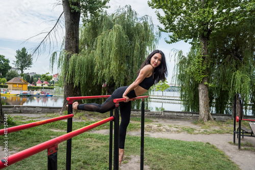 Fototapeta premium Young fitness woman in sportswear performing exercises on the horizontal bar for perfect body.
