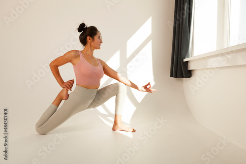 Fototapeta premium young flexible girl does yoga and gymnastics, flexibility and stretching