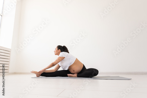 Fototapeta premium Young flexible pregnant woman doing gymnastics on rug on the floor on white...