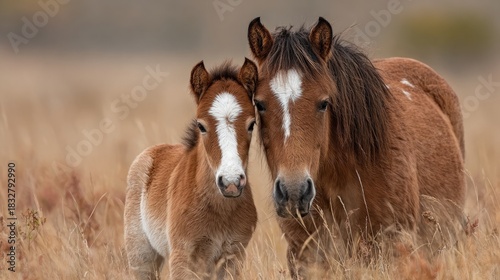 Obraz premium Young foal playfully exploring grasslands alongside its mother evoking...