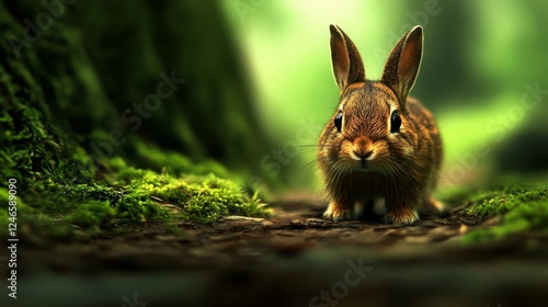 Fototapeta premium Young Forest Rabbit Gazing Intently Mossy Ground