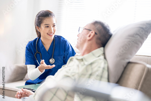 Fototapeta premium Young friendly asian female nurse or caregiver talking to elderly man in...
