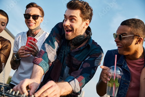 Fototapeta premium Young friends enjoying a vibrant rooftop party filled with music and laughter