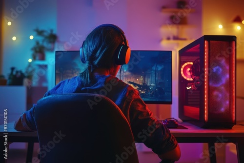 Obraz premium Young gamer playing first person shooter on computer with headphones in a home gaming setup