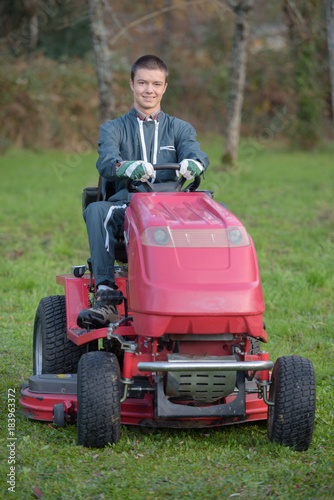 © auremar, Fototapeta premium young gardener on a lawn tractor