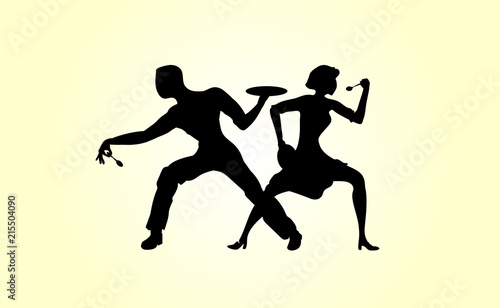© Nanotrillion, Naklejka premium Young girl and young man in a cafe hungry looking for food with spoon and plate. Vector hungry illustration