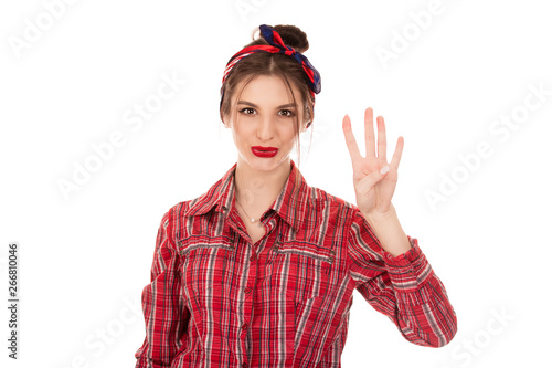 © hbrh, Fototapeta premium Young girl counting four over pure white background