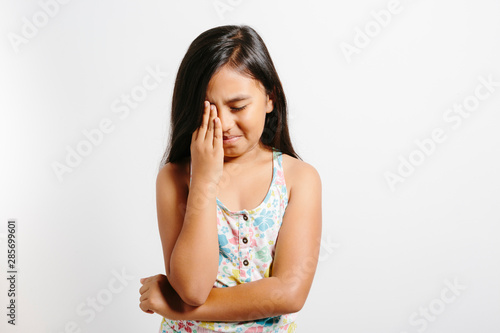 Fototapeta premium Young girl crying over white background.