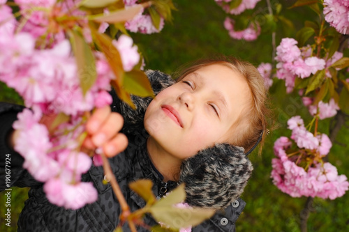 Fototapeta premium Young girl enjoys spring. She is resting at a tree with pink flowers