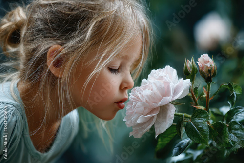 Fototapeta premium Young girl enjoys the fragrance of a blooming flower in a lush garden during...