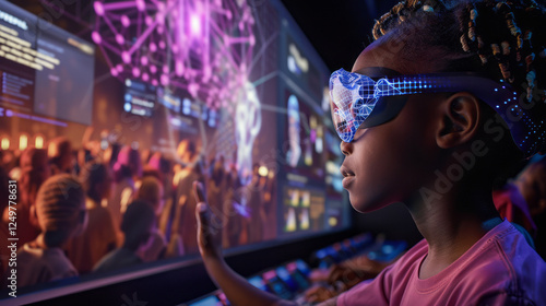 Obraz premium Young Girl Exploring Metaverse: A curious young girl wearing futuristic...