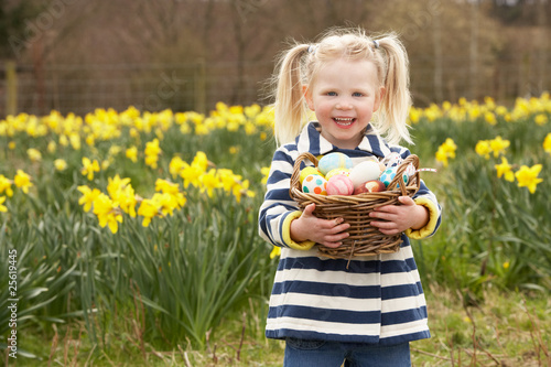 Fototapeta premium Young Girl Holding Basket Of Decorated Eggs In Daffodil Field