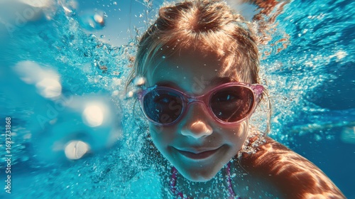 © netsay, Naklejka premium Young Girl in Bright Blue Pool, CloseUp Swimming Shot Vibrant Summer Leisure, Perfect for Social Media or Lifestyle Campaigns, Invigorating Scene Ideal for HighEnergy Campaigns.