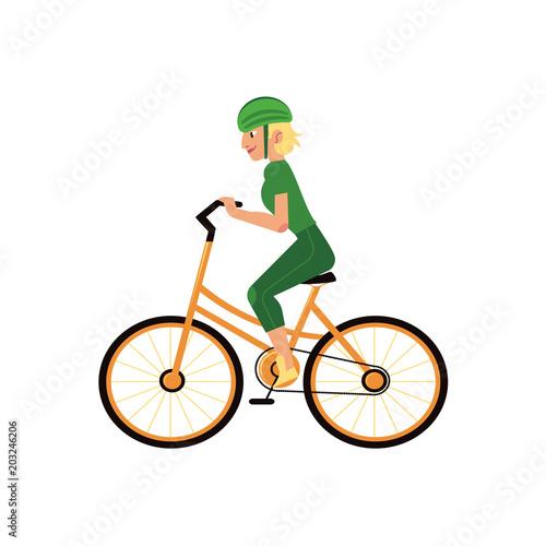 © sabelskaya, Fototapeta premium Young girl in helmet riding urban bicycle isolated on white background. Summer active leisure concept - cartoon female character with sports protection pedaling, vector illustration.