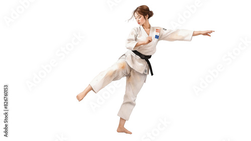 © Nailotl, Fototapeta premium Young girl in kimono doing karate exercises concept of judo, taekwondo, karate, training, kick, action, sport, practice, active, exercise, woman, white, health