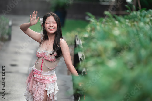 © phaitoon, Fototapeta premium Young girl in traditional attire smiling and waving outdoors