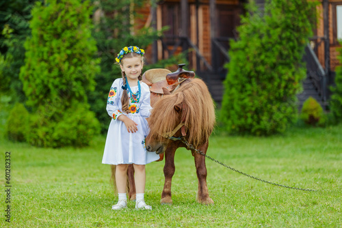 Obraz premium young girl in Ukrainian national dress strokes a pony that grazes on the lawn