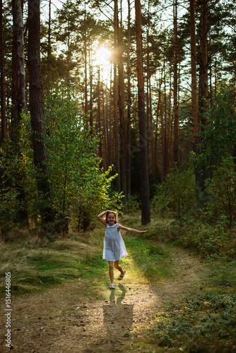 Fototapeta premium Young girl joyfully running along a forest path, surrounded by tall trees and vibrant greenery, capturing the essence of childhood freedom and nature exploration