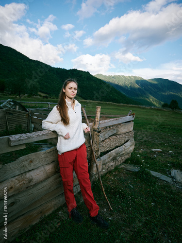 © SHOTPRIME STUDIO, Fototapeta premium Young girl leaning on a rustic wooden fence in a mountainous countryside, wearing a white sweater and red pants, exploring open pasture beneath a bright blue sky.