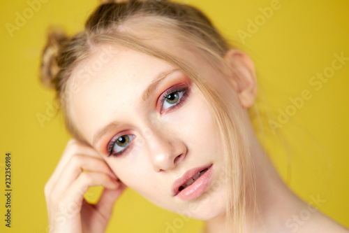 Obraz premium young girl on a yellow bright background. beautiful makeup, bright image,...
