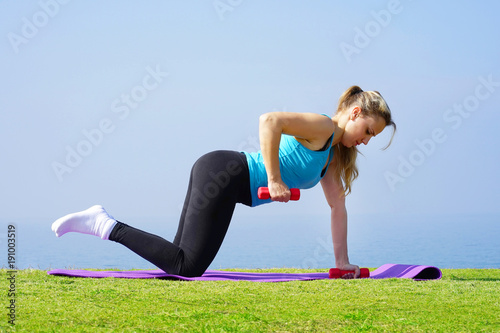 © polack, Fototapeta premium Young girl on grass with dumbbell in hand on the background of the sea. Fitness girl doing exercises with weights on the beach under the spring sun. Concept of health and weight loss.