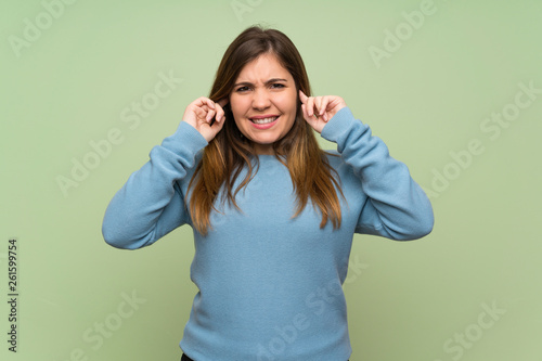 Fototapeta premium Young girl over green wall frustrated and covering ears
