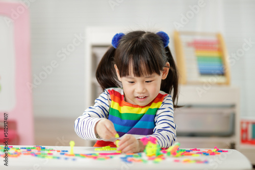 © M-image, Fototapeta premium young girl playing creative blocks for homeschooling