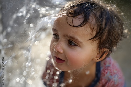 Obraz premium Young girl plays in a fountain of streaming water on a sunny day