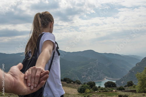 © Adolf, Naklejka premium Young girl shaking hands by the mountain