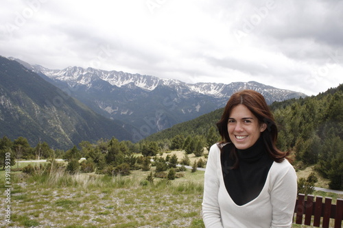 Naklejka premium young girl sitting with mountains in andorra