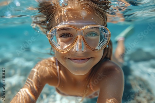 © Larisa AI, Naklejka premium Young girl smiles brightly while submerged, wearing a snorkel mask that reflects the clear blue water