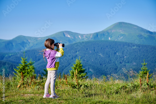 © anatoliy_gleb, Naklejka premium Young girl stands in grassy meadow, looking through binoculars, wearing yellow and purple sweatshirt. Behind her, rolling green hills and mountains stretch into distance under clear blue sky.