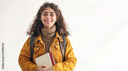 Fototapeta premium Young girl student with books. Teenager female indoors, smiling and holding a book. She is standing in front of a white background.